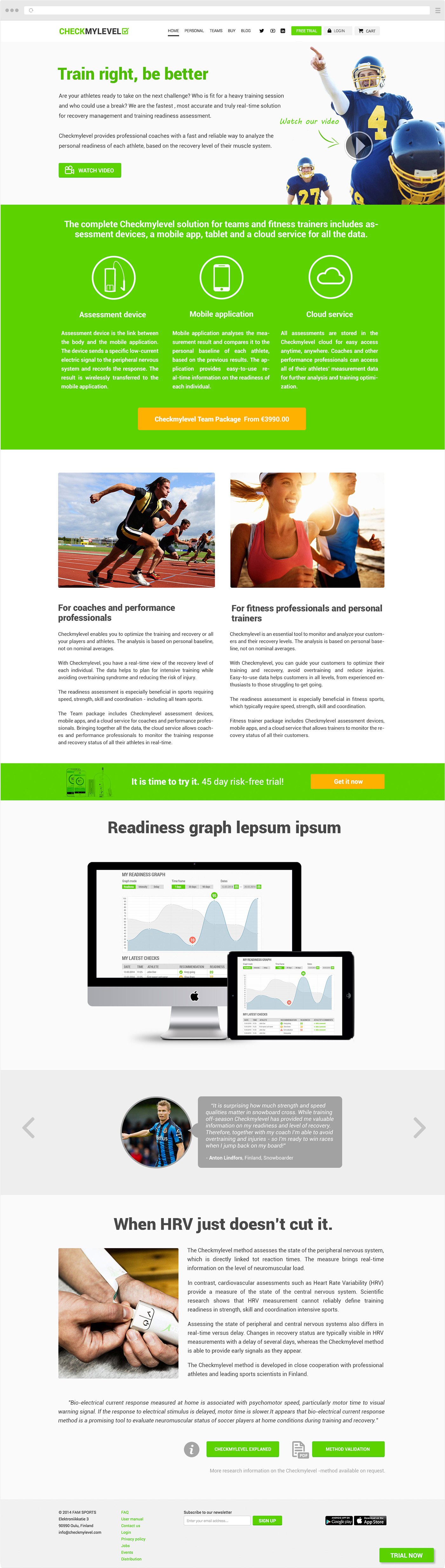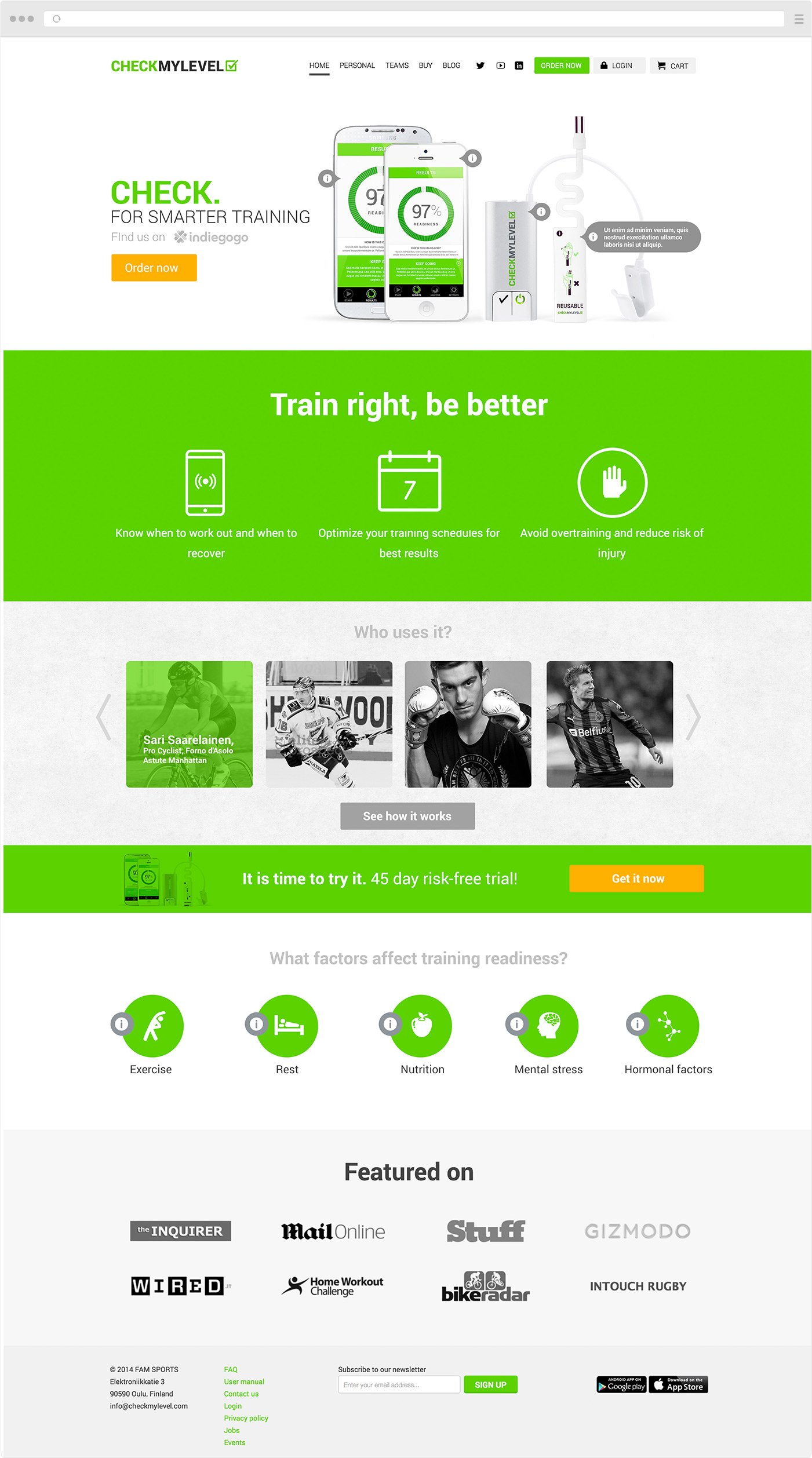 On the landing page I went for a sharp and straightforward message for what this device is about, further I added some short facts and explanations about this method. Convincing facts of WHO USES this device, I proposed to go for famous athletes pictures and names. This proved to be a good idea, as per 3 months revenue increased by 24% after website redesign and CHECKMYLEVEL received some great feedback from its users.