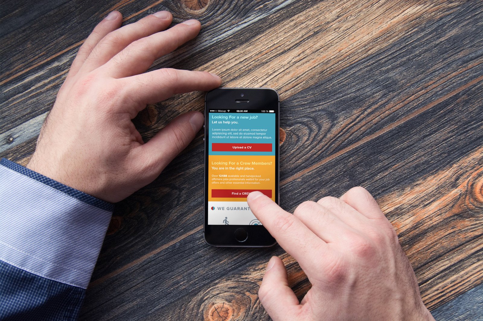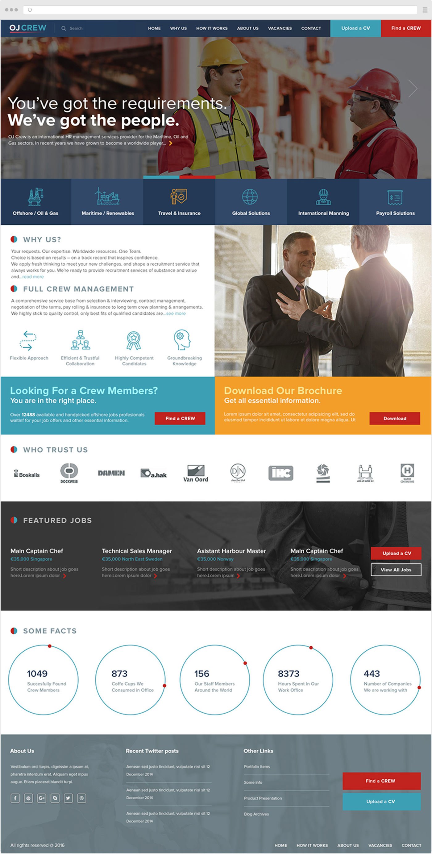 Scrolling through the landing and inner pages, we implemented strong call to action buttons that stick out from the rest of the designs. These call to actions mainly provoke two actions - FIND A CREW or UPLOAD A CV. Short preview of available jobs had significant impact on conversions from the landing page. And showing some strong facts about company improved trust and liability of OJCREW for its potential future clients.