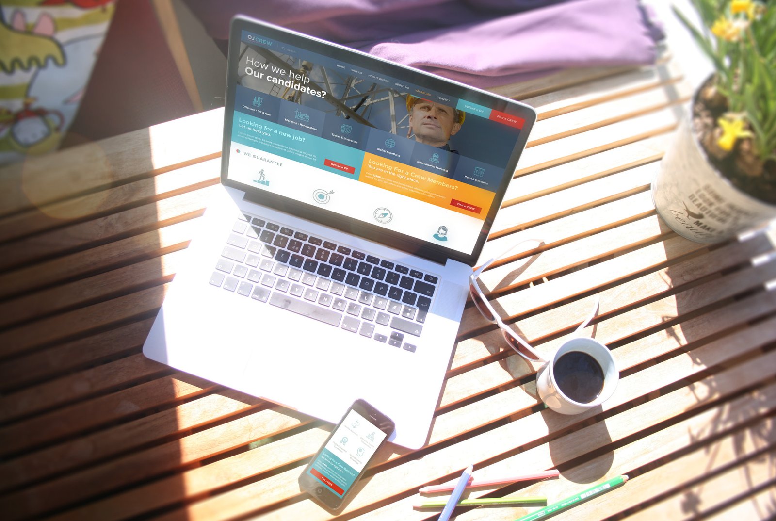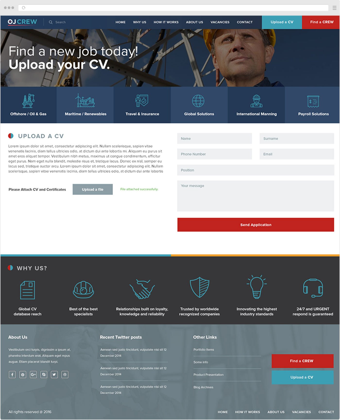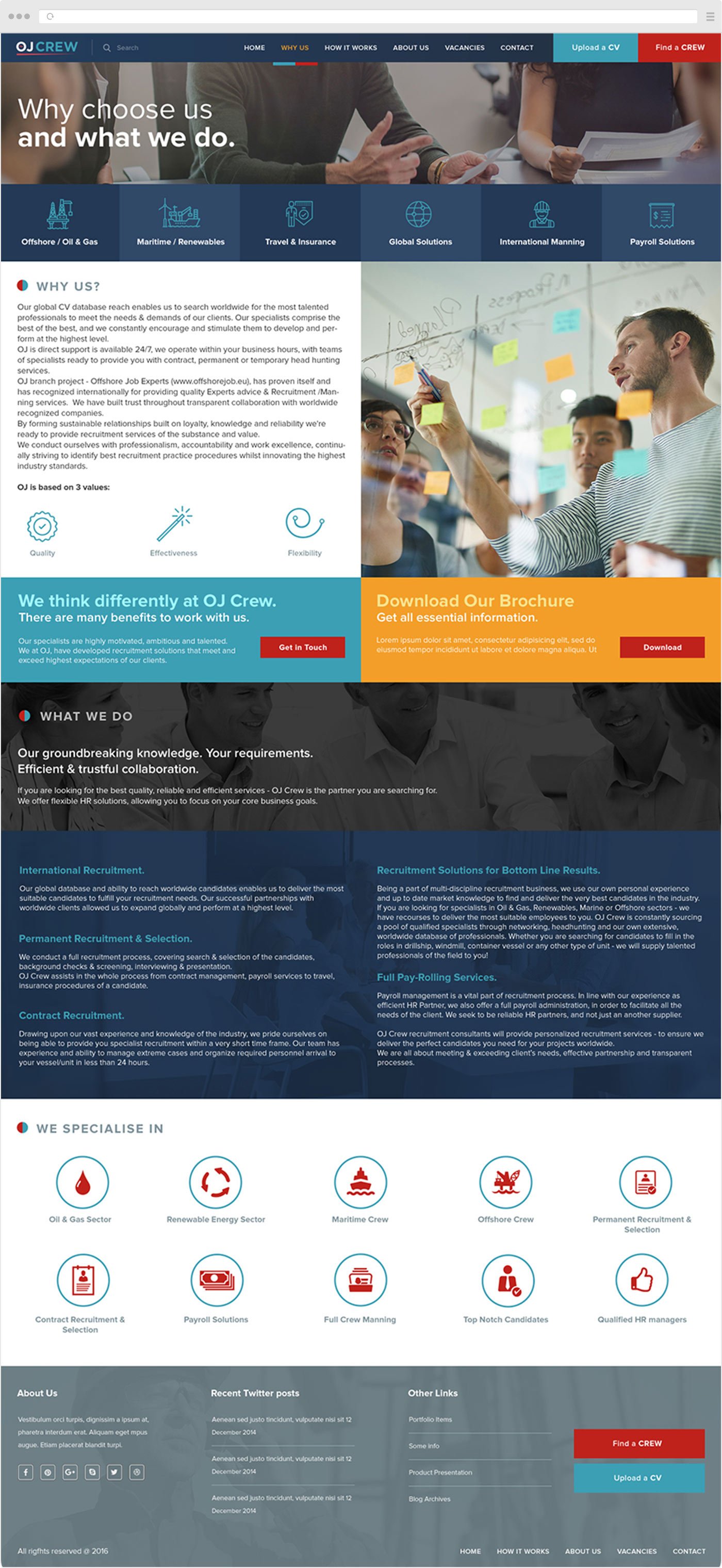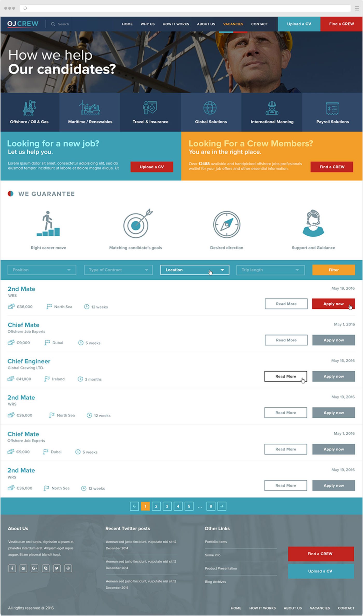 To create a web-based platform where they can easily showcase their services and products.They work with two types of clients: Offshore companies looking for crew and employees looking for jobs. Companies should find it easy to recruit candidates for their crews, and employees should find easy access to available vacancies. The main goals and call to actions for companies is to FIND A CREW and for potential employees to UPLOAD A CV