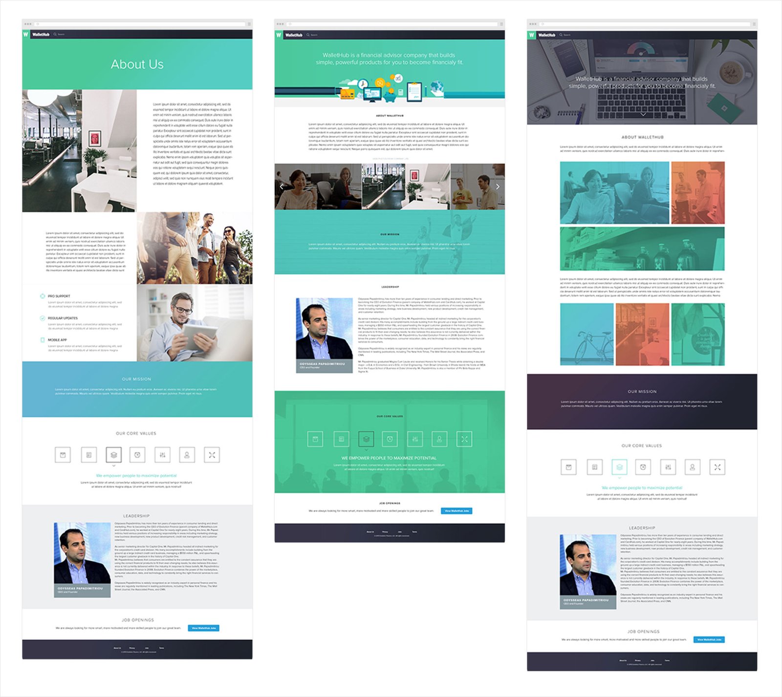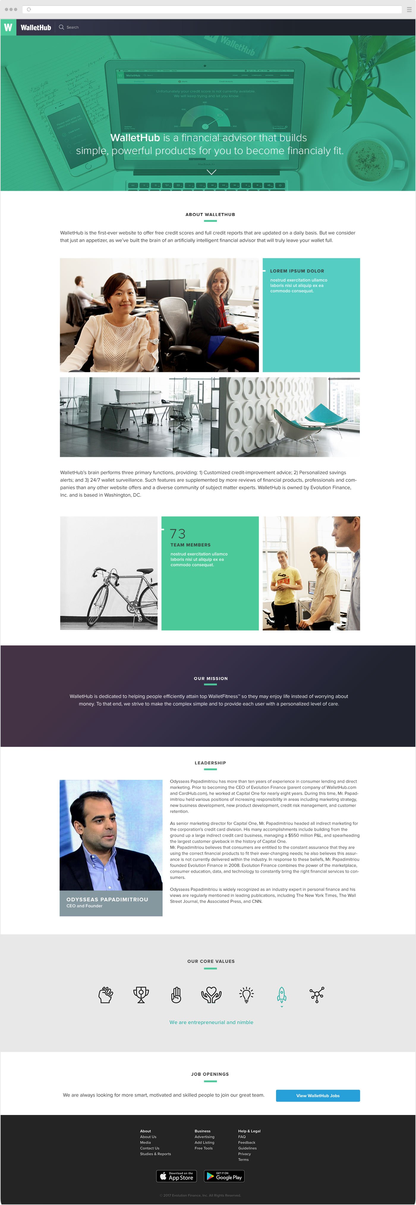 Header image sends the message of what WalletHub product looks like and what it is about. Middle part of the page shows a few images of our team life at the office, etc. Then there is a part for WalletHub mission statement, leadership information and company values.