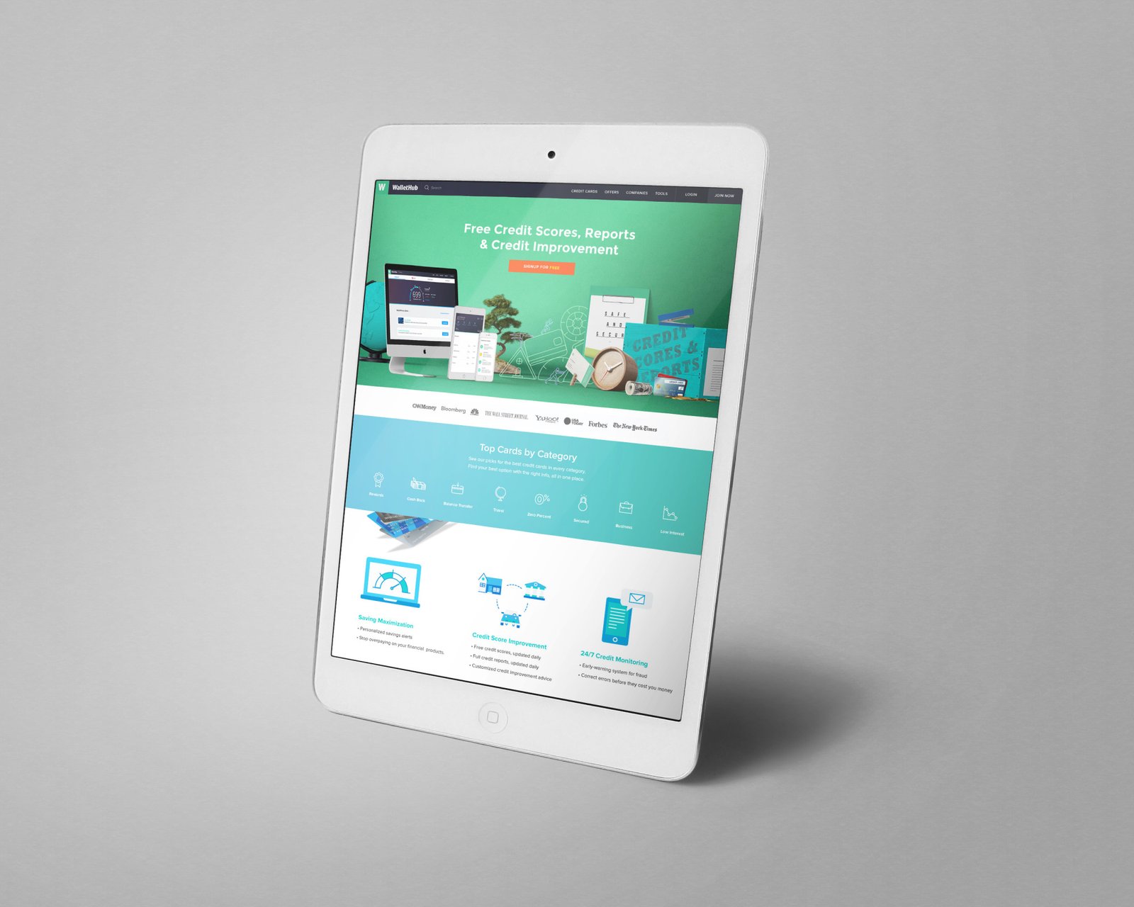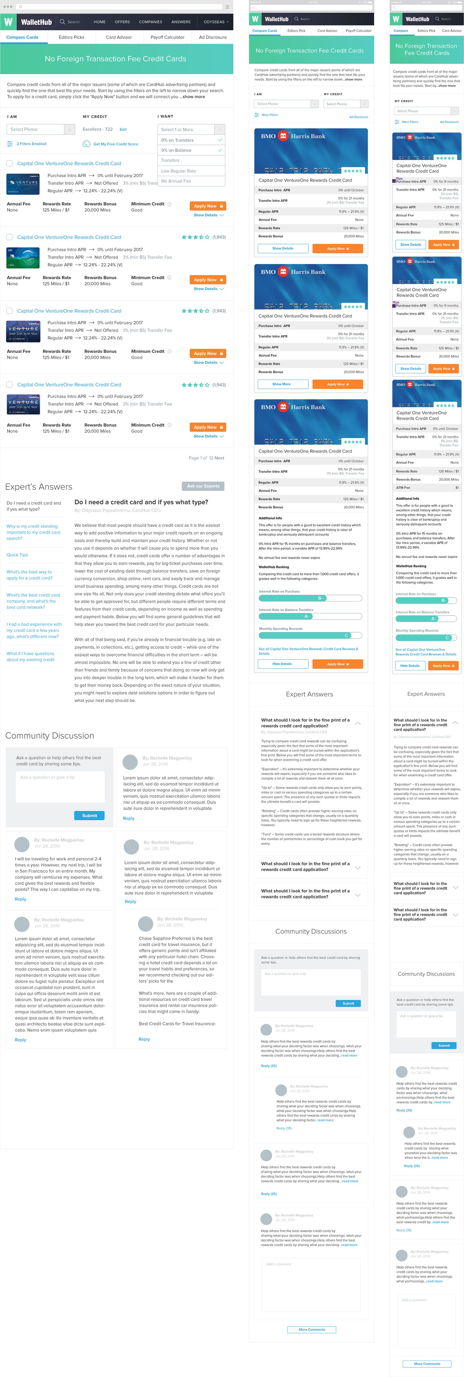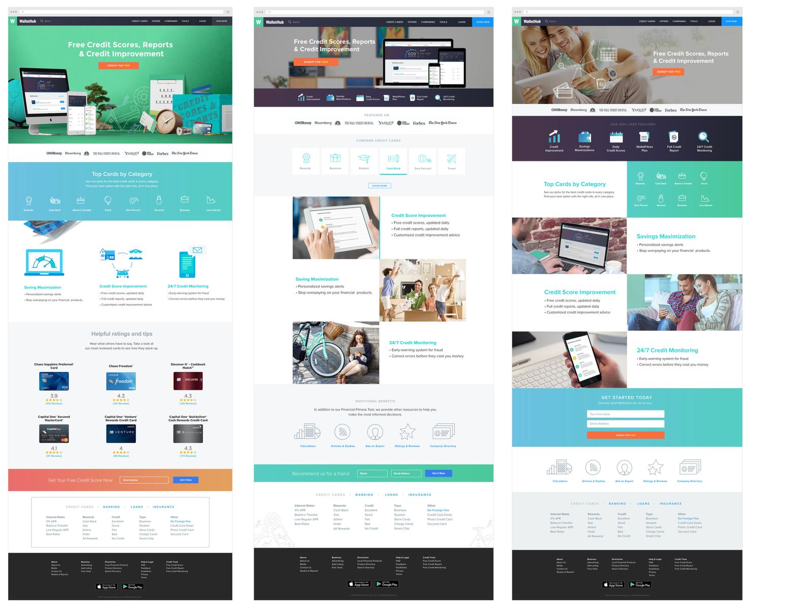 My main focus and goal was to send a straightforward message as to what WalletHub is about. Also, to decrease the height of the header, and to show CREDIT CARD CATEGORIES without too much scrolling through the page show. Credit card search tool is the main revenue source for this product, so showing the credit cards at the top and under the header was a sensible and efficient decision. Instead of showing the header image with illustration of a couple (that resembles a dating app), I decided to go with a product screenshot and showcase them in different devices.