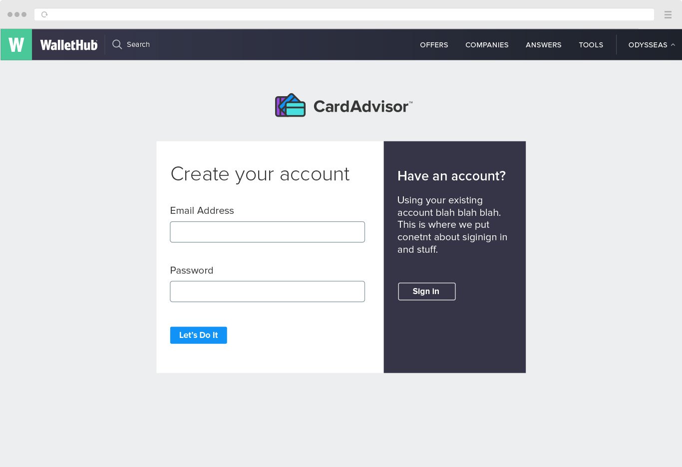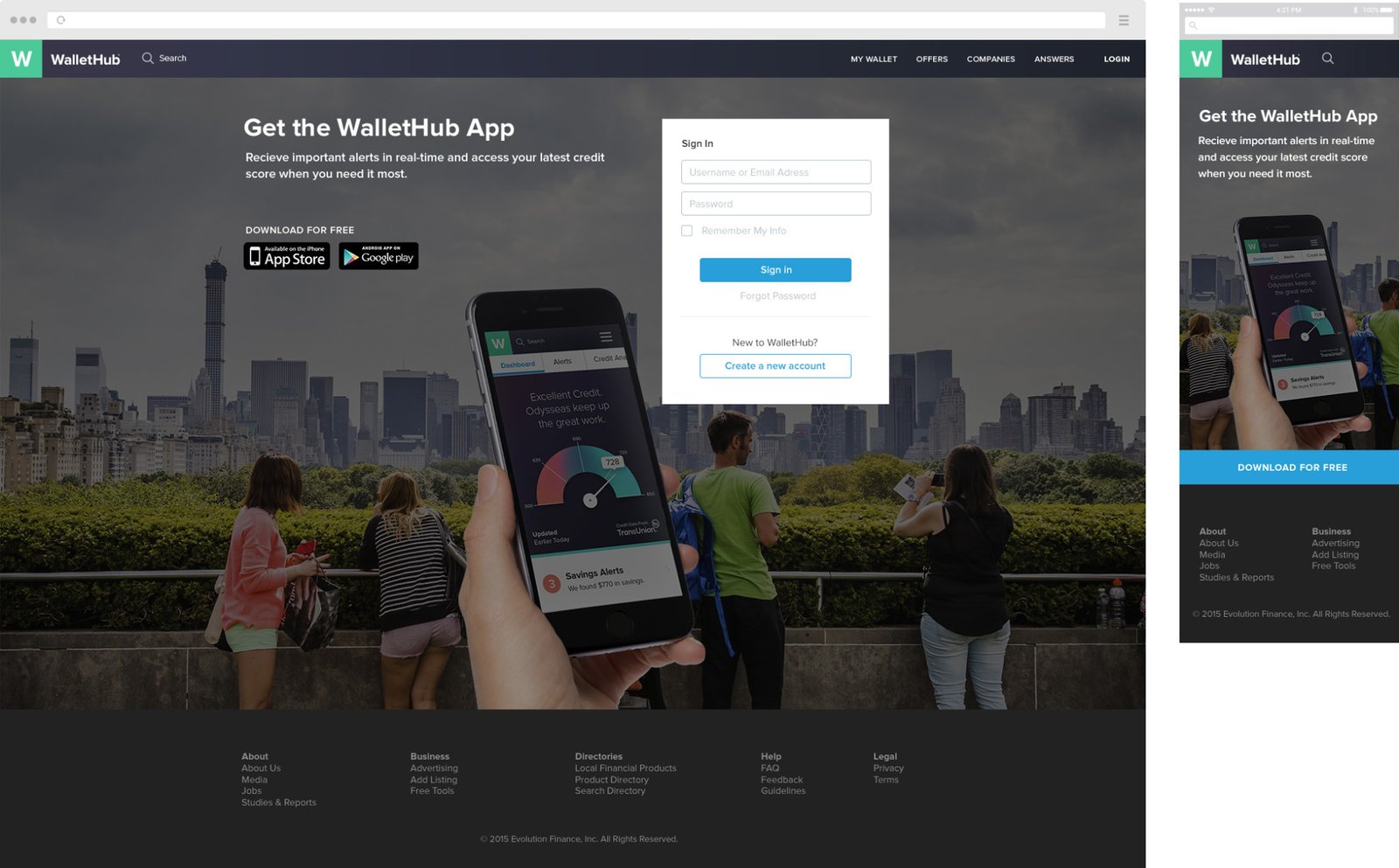I was asked to design a page which people will get after they sign-out from WalletHub website. Company's goal was that this page should have some value for people, so I offered ideas of showing AD of our mobile application or offering for user a special credit card offer that suits their needs. Below you can see some results of my work.