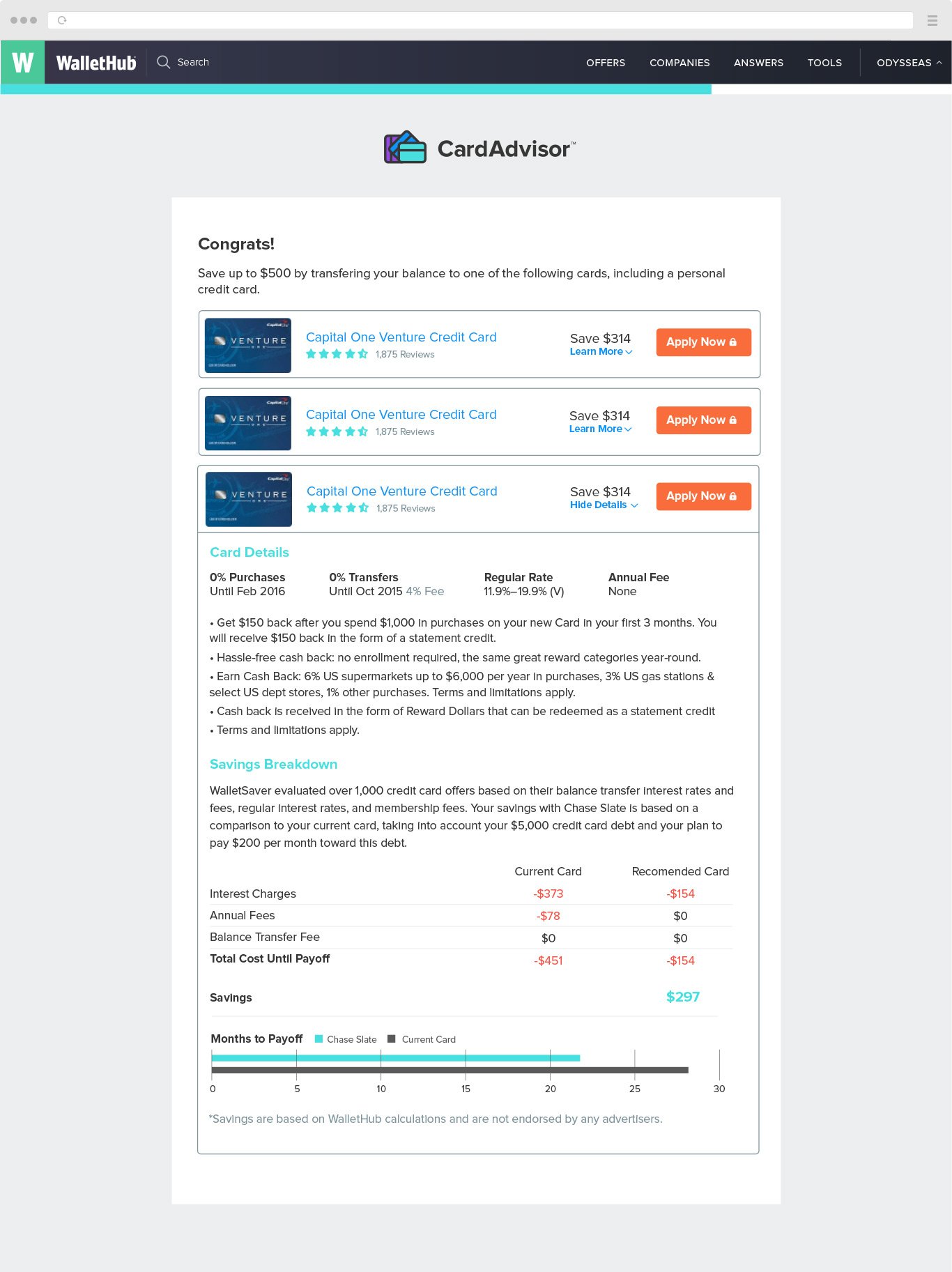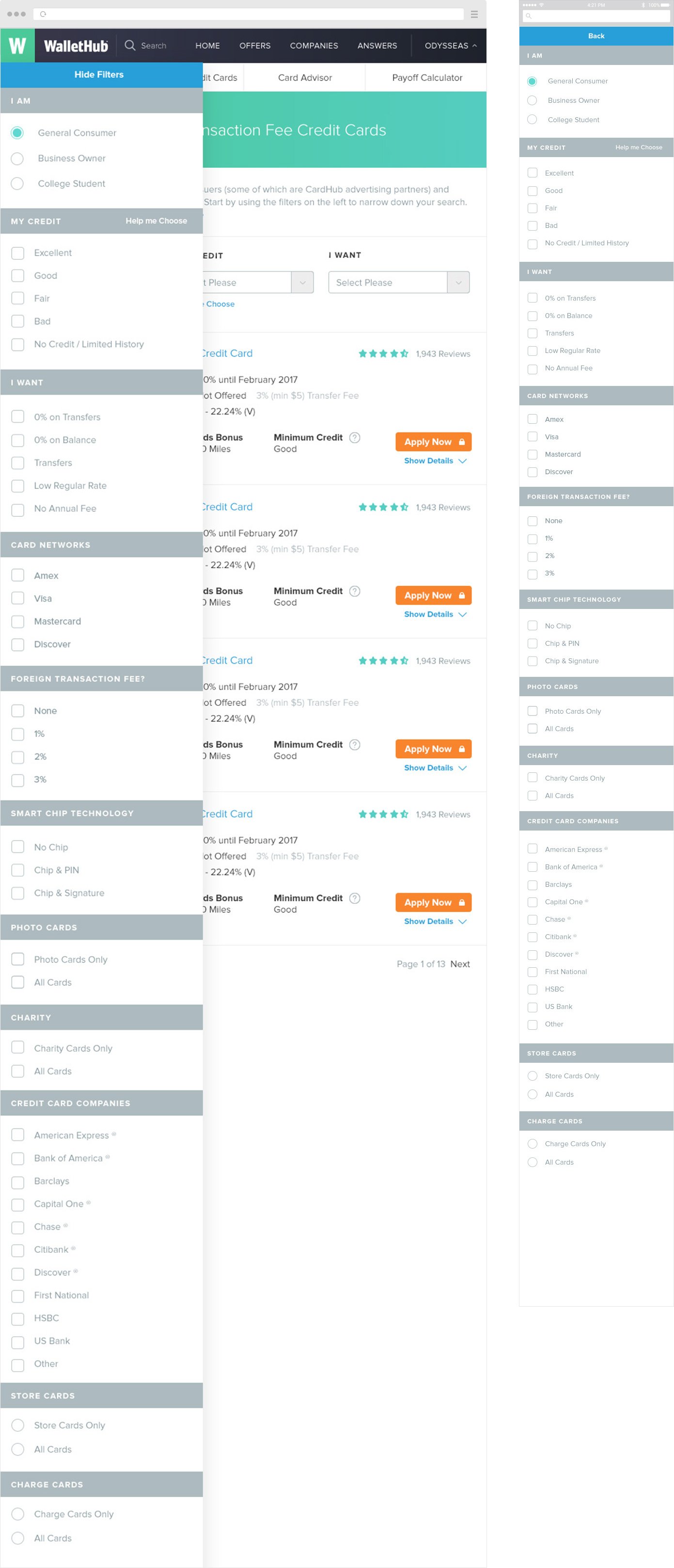 Searching for credit card which suits your needs is not easy if a web page that you are using is hard to read or navigate. Our goal was to create a credit card search tool inside of our WalletHub page, where people can use filtering options and see what credit cards available for them. Results depends on various variables, for example: a.) user has a bad or good credit b.) they are studying or having businesses c.) looking for best reward rates, etc.