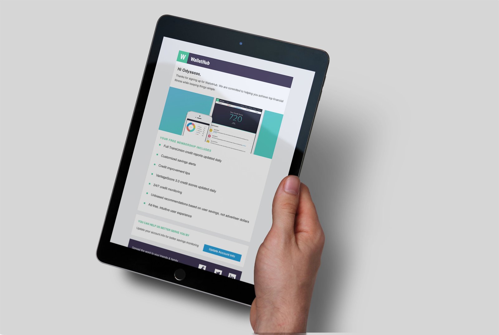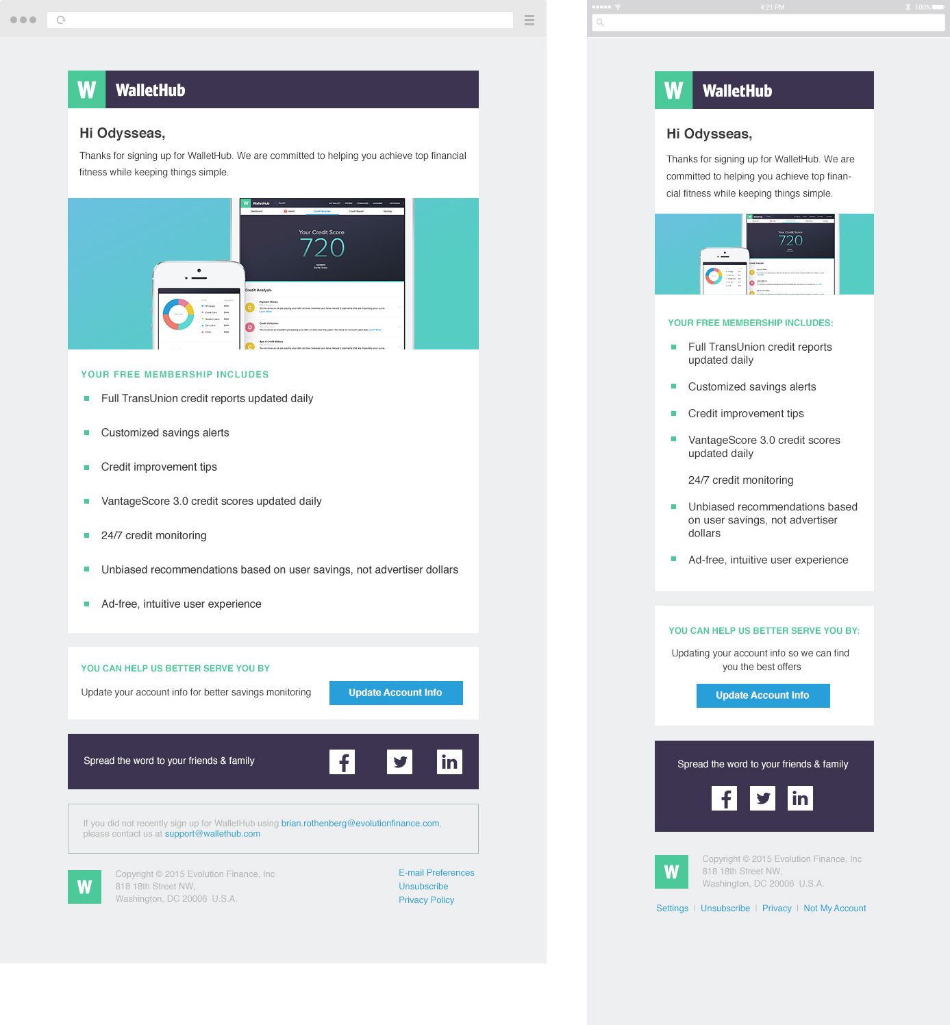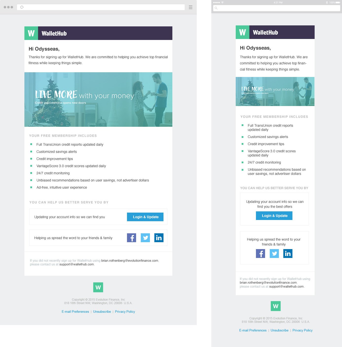 During period of working for WalletHub I designed some email templates which was used for various cases and scenarios. Below you can see desktop and mobile versions of email templates for welcoming after you signed in or website system is informing you about how big you can save, etc.